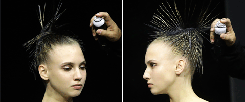 Step 2 | Angelo Seminara hat das Haarband, für den Stachel-Look vorher präpariert. Im nassen Zusand wird es gewachst und noch nass mit 20 Schichten Haarlack besprüht.