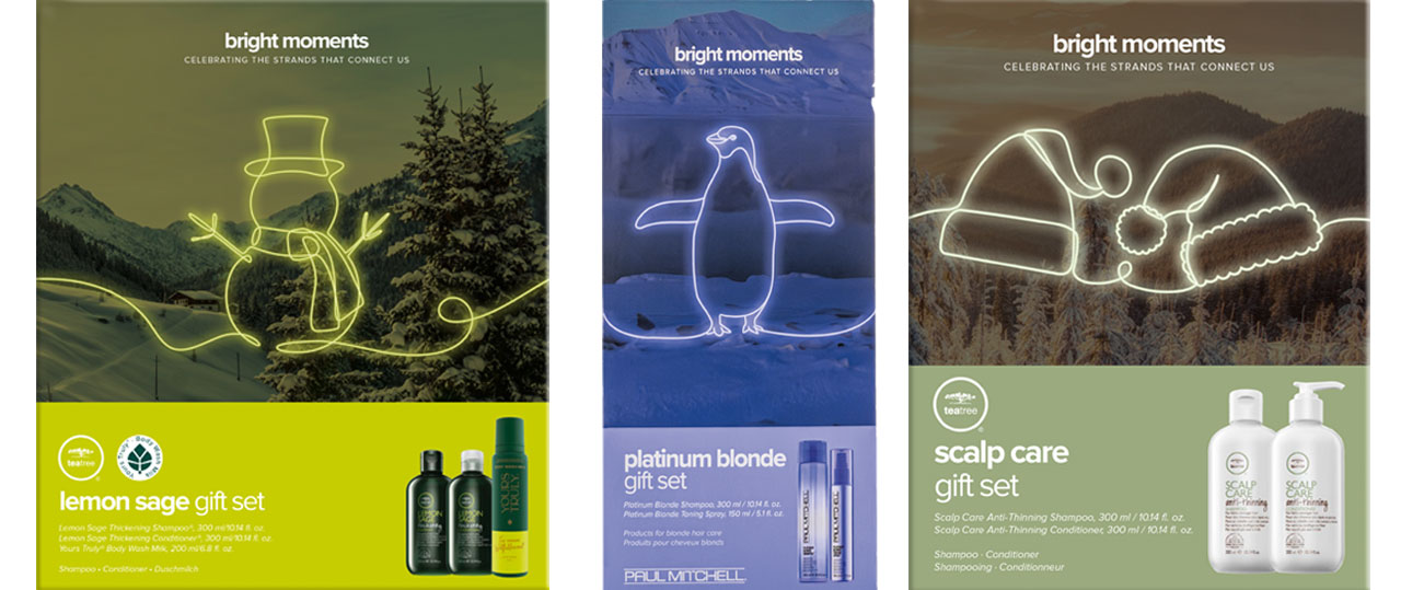 Mit den Unisex-Geschenksets von Paul Mitchell kann man nichts falsch machen. Die Xmas-Sets von mit Grafiken im Look leuchtender Neon-Schrift machen sich super unter dem Weihnachtsbaum oder als weihnachtlich, moderne Deko im Salon-Schaufenster.