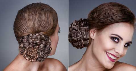 Step 1| Seitlich einen Zopf binden und ein Donut befestigen. (Das Modell hatte sehr kurzes Haar. Deswegen wurde ein fertig gelocktes Haarteil verwendet).