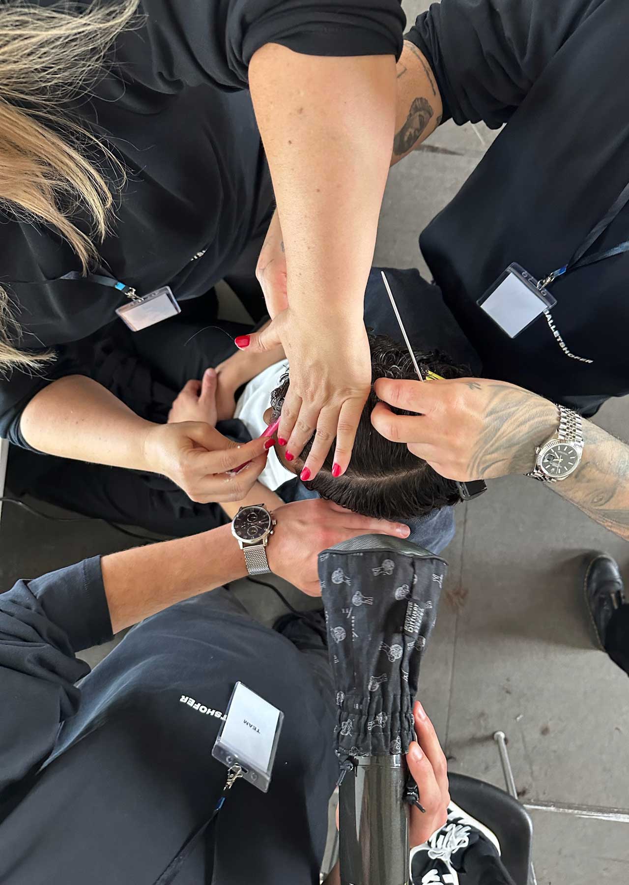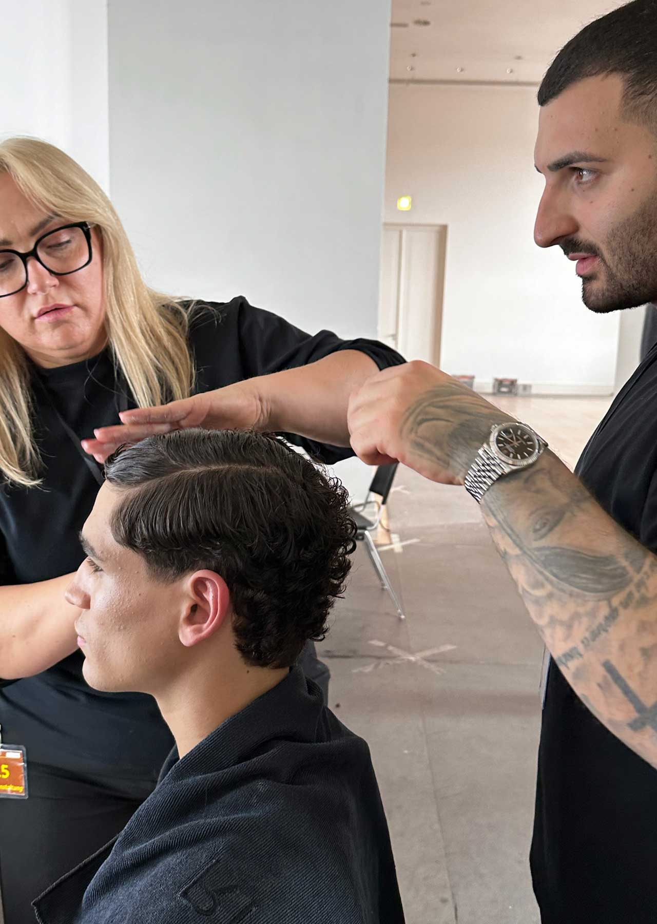Gemeinsam im Team entstanden Looks Frisuren, perfekt auf die Designs von Alan Balletshofer abgestimmt. Mit hochwertigen Tools kreierten sie präzise und innovative Looks, die die klaren Visionen des Berliner Designers zum Leben erweckten.