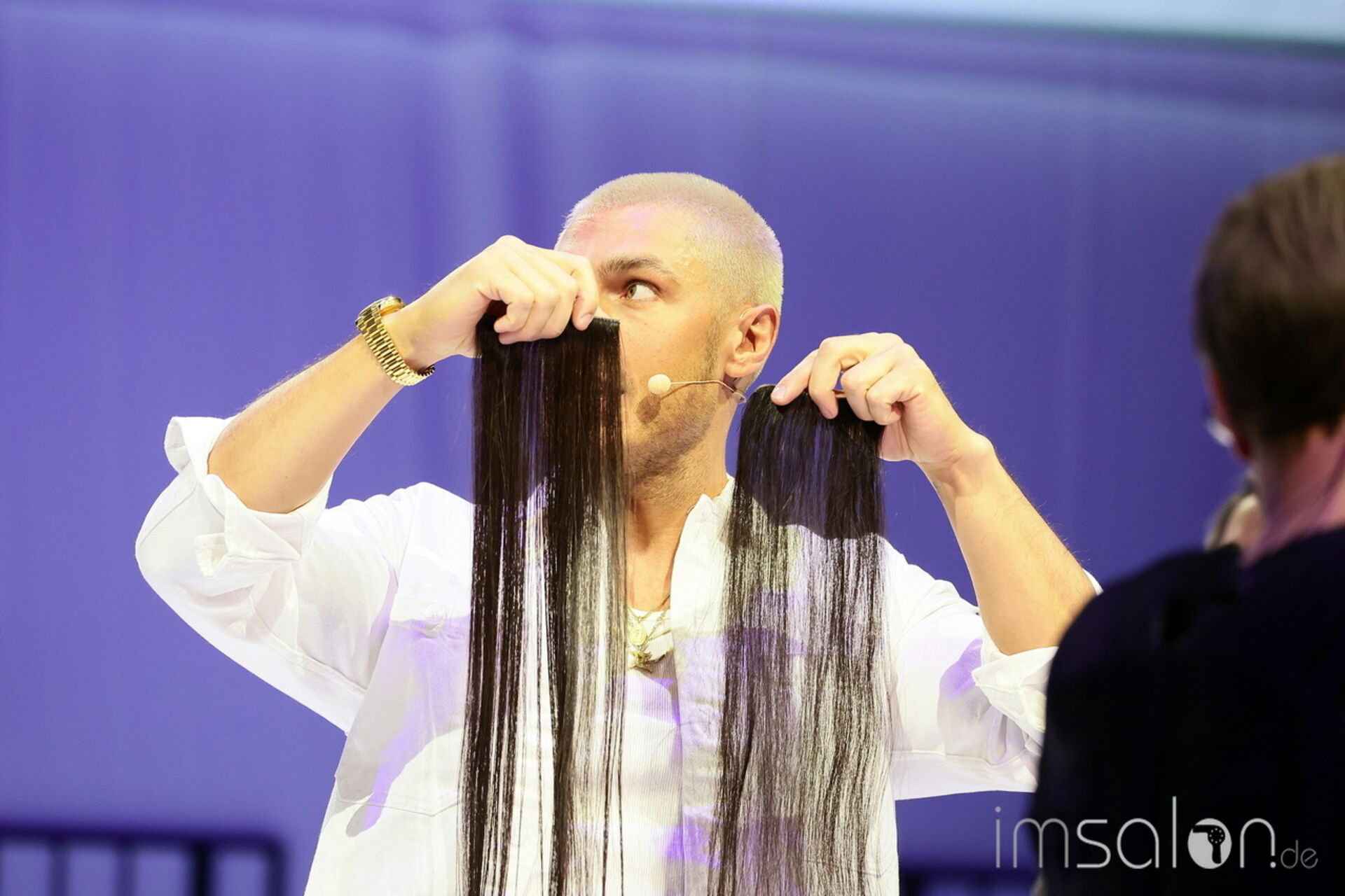 Der amerikanische Superstar frisiert VIP`s wie Kim Karadashian, Kate Perry oder eben Jennifer Lopez. Auf der großen Showbühne der TOP HAIR Messe kreiert er Super shiny expensiv Loopings Hair und verrät Tricks, mit denen er seinen prominenten Kundinnen Volumen ins Haar handwerkt: mit Tressen, Lockenstab und Glätteisen.