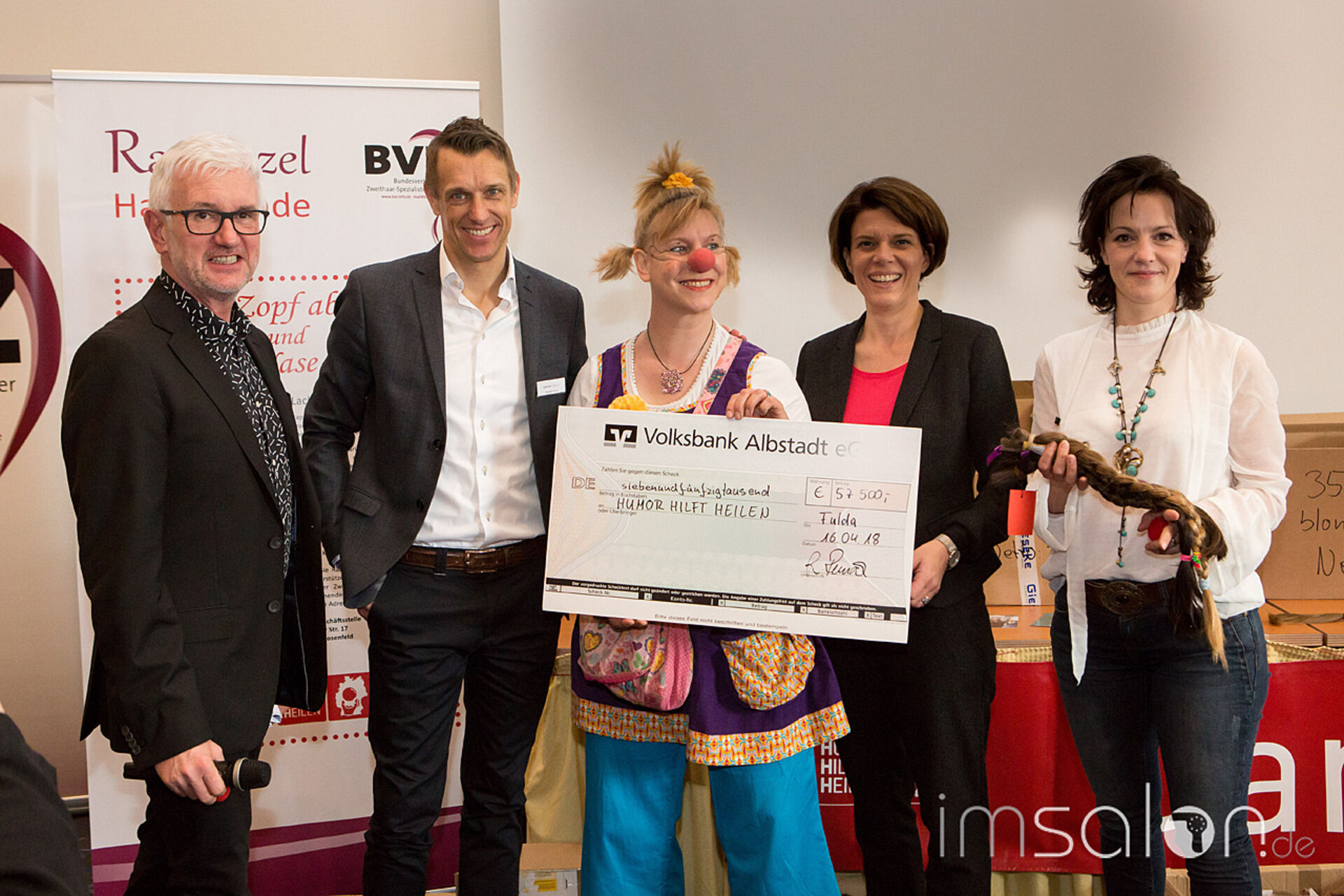 Humor hilft heilen! Wie in jedem Jahr ist die Rapunzel-Versteigerungfixer Bestandteil der Zweithaar-Messe. Endverbraucher und Friseure aus ganz Deutschland haben Zöpfe gesammelt, 130 Kg insgesamt, mit einem Gegenwert von 57.500,- Euro. Herr Dening (Dening Hair GMBH, www.dening.de/) gab dieses Höchstgebot an den BVZ. Der gesamte Erlös kommt dem Verein HUMOR HILFT HEILEN von Dr. Eckart von Hirschhausen zugute.