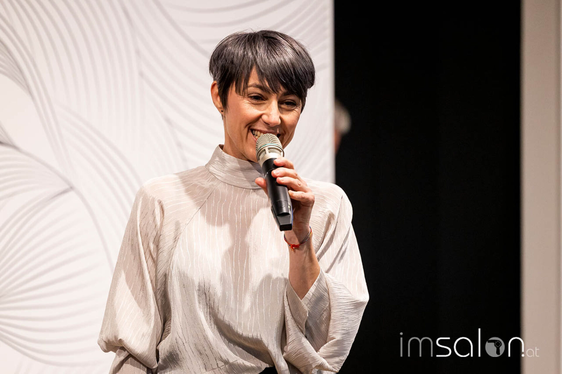 ►Birgit Keppel, Senior Education Managerin Wella Company, betreute im vergangenen Jahr die Studio-Neuentwicklung. Sie begrüßte zu Beginn der Show die ersten Gäste im voll besetzten Studio und übergab an Gerald Battle Welsh.