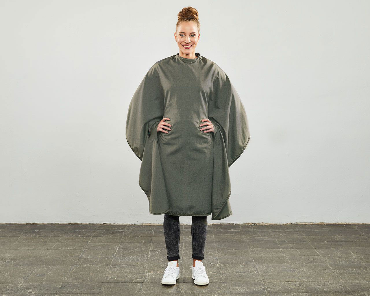 FR: Das ist in vielen Gesprächen mit Kunden entstanden und etwas wirklich Besonderes. Einen großen Umhang hatten wir bereits im Programm. Von unseren Kunden erhielten wir das Feedback, dass das Cape beim Nachvornebeugen immer wieder zwischen Kundin und Stuhl rutscht. Hierfür haben wir eine Lösung gefunden: Ein schwerer Stoff verhindert dies zukünftig, ohne dass der Friseur es anfassen muss. Damit die Kundin darunter nicht schwitzt, ist das Cape vorne luftig leicht und hinten lang und wasserdicht. Perfekt für eine Balayage-Färbung.